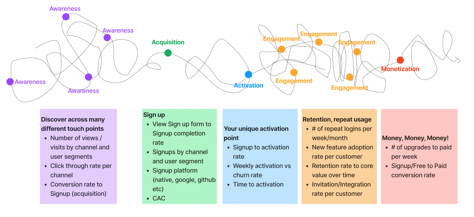 Acquisition: In most cases, the acquisition is the same as signup but can be different for specific industries or tools. For e.g., if you are running an open-source project, this could also be forking your repo.